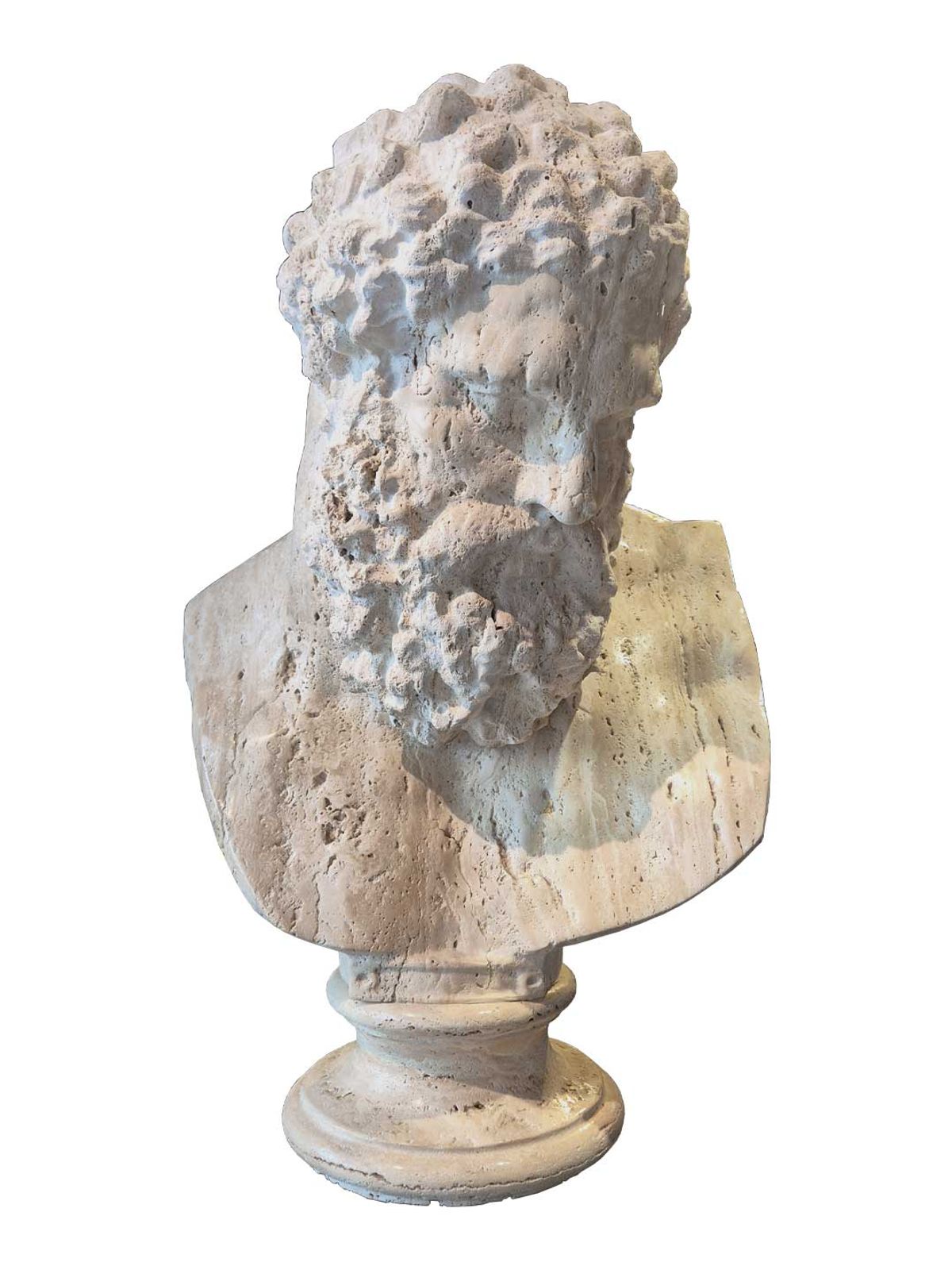 Inspirée du fameux Hercule Glycon, mais connu sous le nom d'Hercule Farnese, ce buste figure toute la puissance du héros de la Grèce Antique. Sculpté ici en Travertin, il s'intègre avec force dans les décors les plus contemporains.