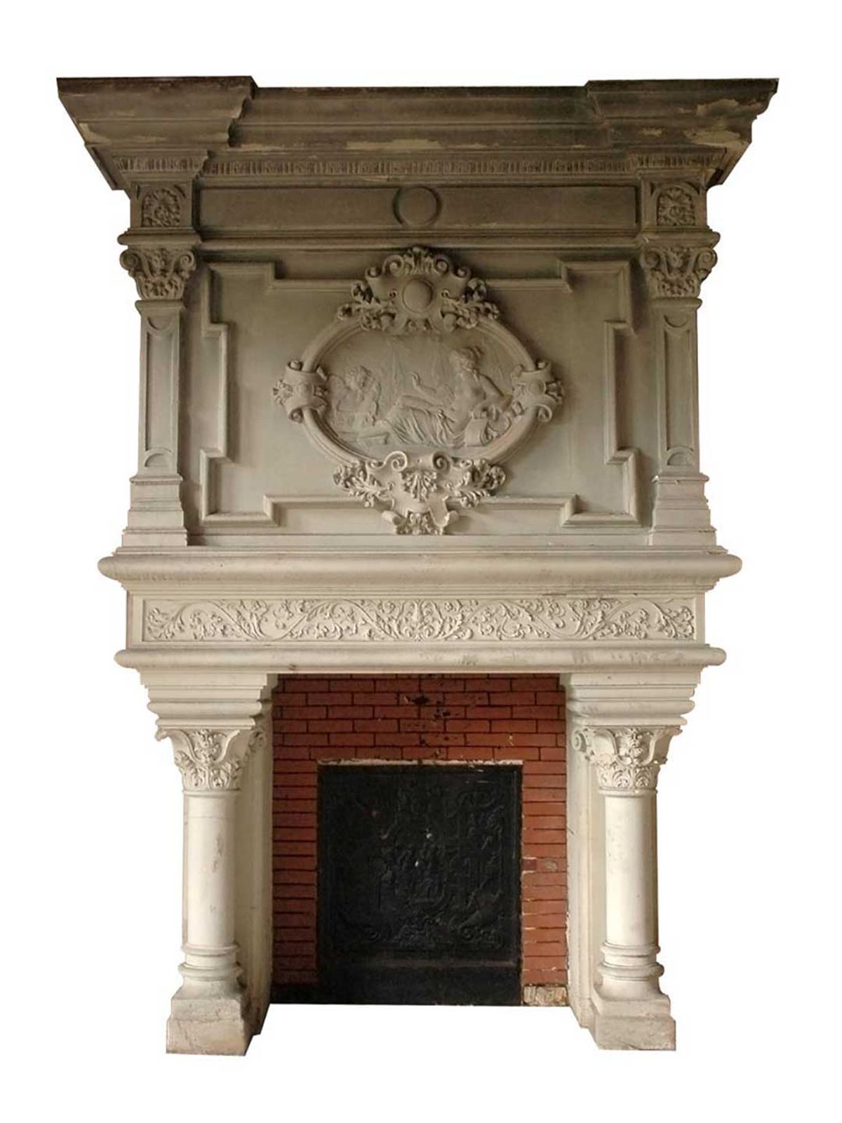 Cette impressionnante cheminée en pierre de style Néo-Renaissance est inspirée de la cheminée monumentale du Château d'Azay-le-Rideau. En accord avec ses proportions imposantes, de solides colonnes coiffées d’un chapiteau corinthien masquent les jambages qui soutiennent un entablement que des arabesques végétales richement sculptées animent avec souplesse. Une succession de moulures distingue ce décor du registre supérieur de la cheminée, dominé par un médaillon sculpté retenu par quatre agrafes d’enroulements et de feuilles. Dans ce tableau de pierre, une Muse apprend à un ange musicien à jouer de la vielle. Cheminée ne peut etre réalisée que dans une hauteur minimale de 3,8 mètres.