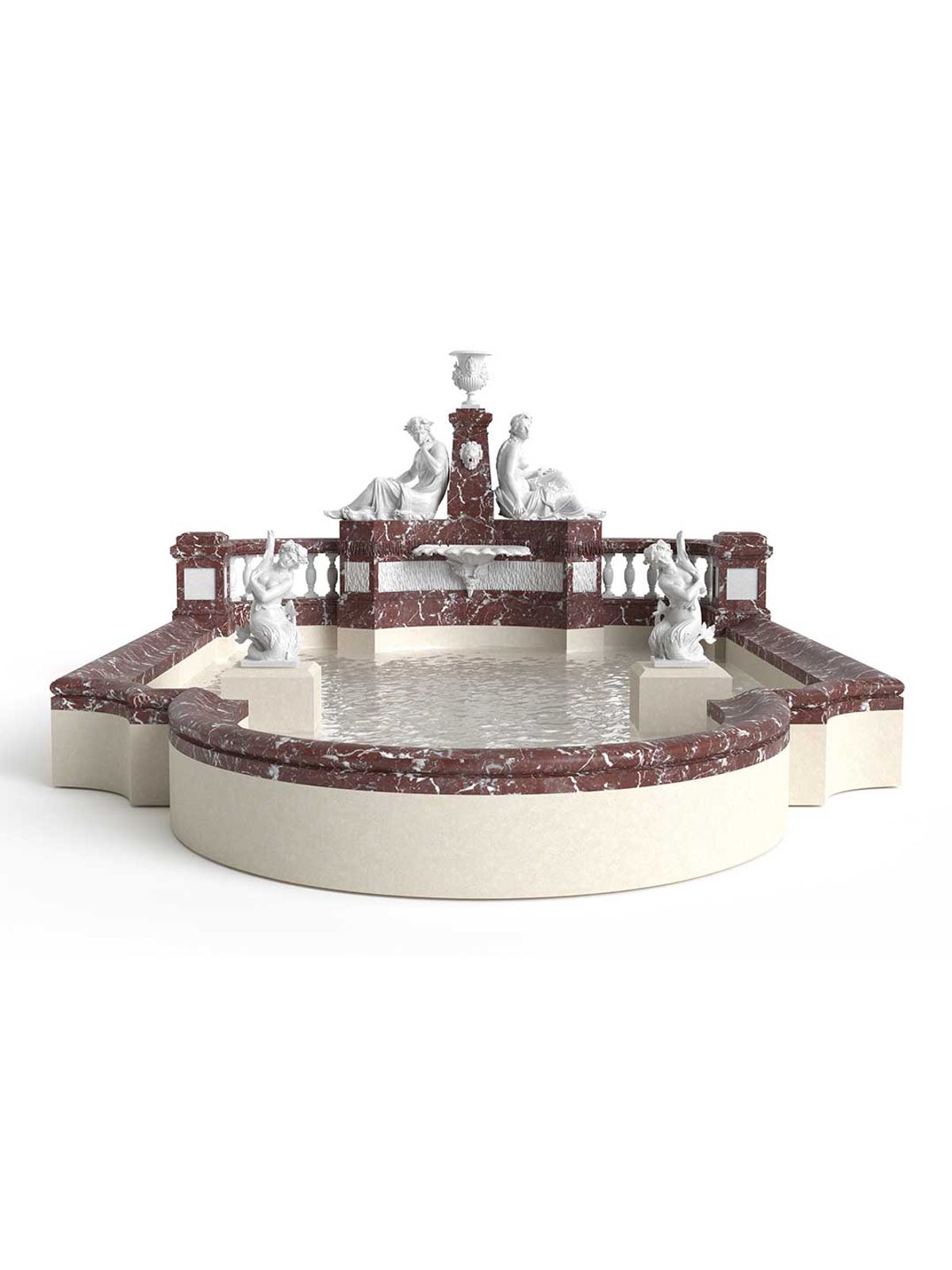 Ce très grand bassin – originellement de 15 mètres de long – est le prolongement d’une fontaine avec dégueuloir , deux statues représentant Acis et Galatée, et un grand vase central. Le couple mythologique Acis et Galatée sculpté d'après un modèle de Mathurin Moreau fut exposé pour la première fois à l'occasion de l' Exposition Universelle de 1855. Le bassin en pierre est surmonté d’une belle moulure Louis XIV en Rouge de caunes.